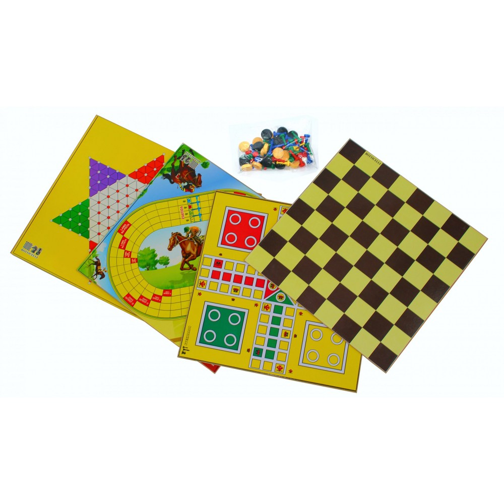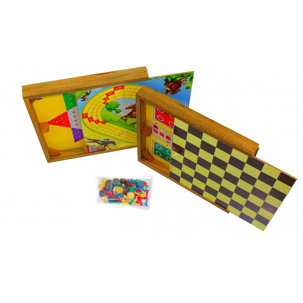 CONJUNTO DE JOGOS DE: (DAMAS/LUDO/HIPISMO E XADREZ-CHINÊS) ACOMPANHA PINOS E DADOS PARA TODOS OS JOGOS.