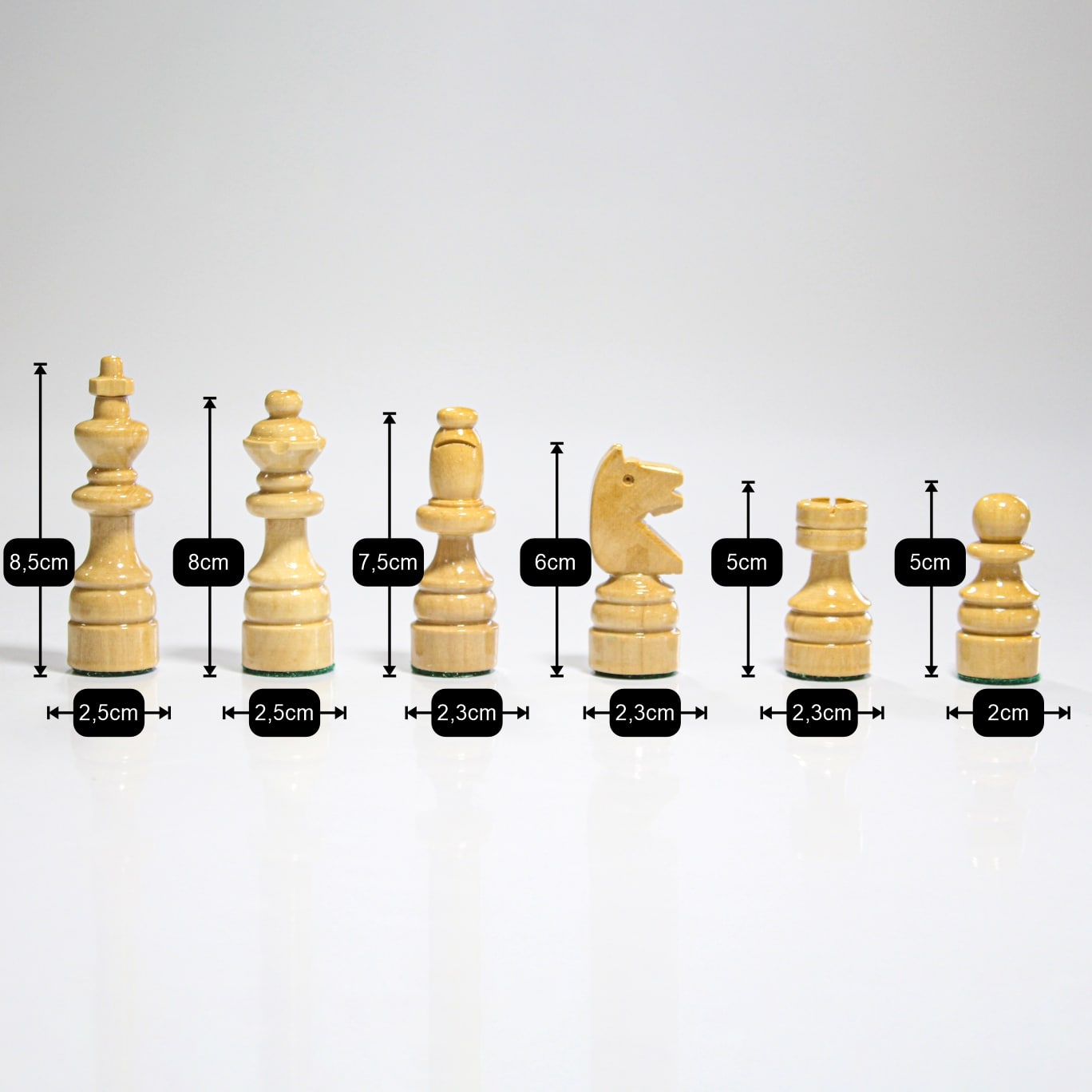 ♟️ Peças artesanais em madeira maciça com base revestida em feltro (sem chumbo), garantindo um deslize suave sobre o tabuleiro e proteção contra riscos.