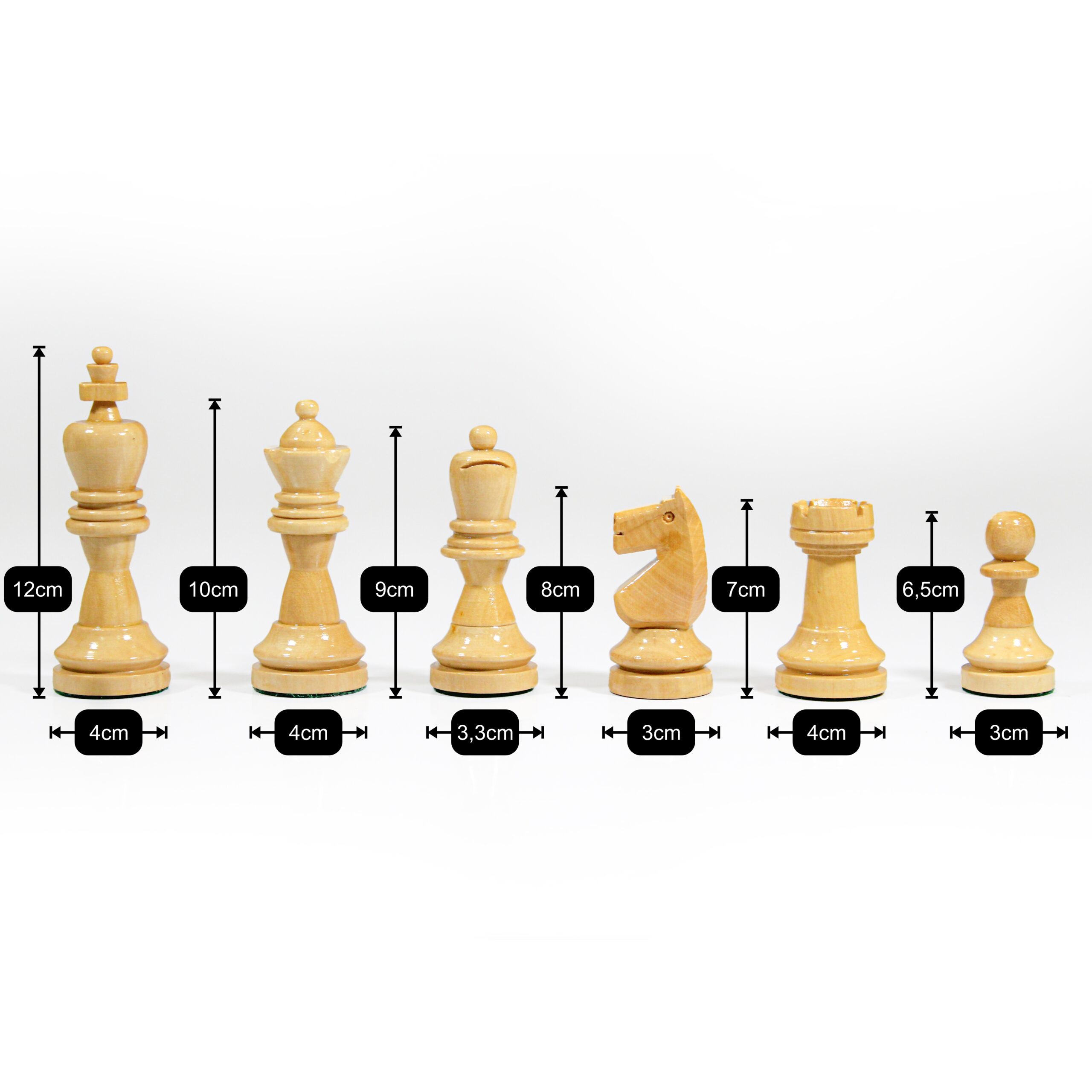 As proporções seguem o padrão internacional de jogabilidade, com o Rei medindo 12 cm de altura, ideal para tabuleiros de porte médio a grande.