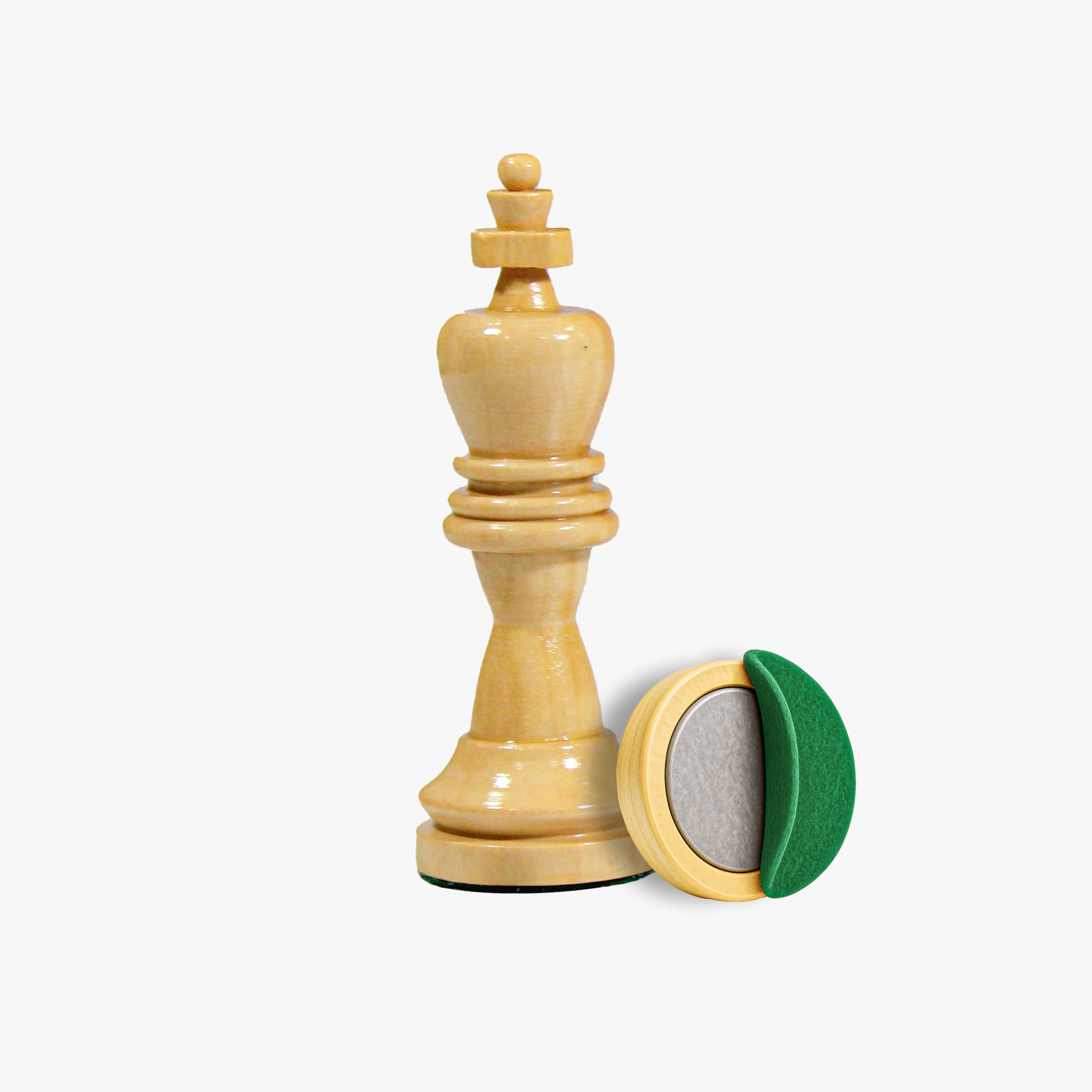 As bases são chumbadas, proporcionando estabilidade superior durante as partidas, e revestidas com feltro verde, o que confere suavidade aos movimentos e preserva a superfície do tabuleiro. O acabamento em verniz PU de alto brilho realça os veios da madeira natural e a profundidade da tinta preta aplicada nas peças escuras.