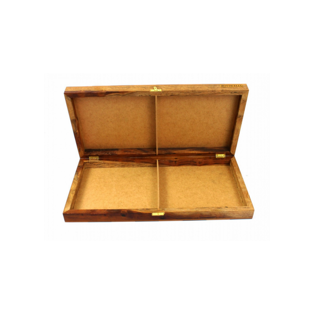 Este elegante tabuleiro é confeccionado em madeira de lei maciça garantindo durabilidade e um visual sofisticado. A parte quadriculada é cuidadosamente marchetada, proporcionando um acabamento impecável e tradicional.